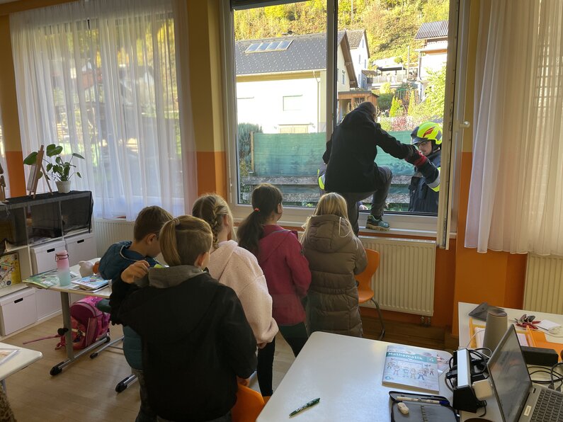 Im Rahmen des Einsatzszenarios wurden die Kinder und das Lehrpersonal über die Fenster im Erdgeschoss ins Freie gerettet. Anschließend versammelten sich die Schülerinnen und Schüler gemeinsam mit den Pädagoginnen und Pädagogen sowie den Kindern des Kindergartens Kainach beim Sammelpunkt beim Eisstockplatz. Ein besonderes Highlight war das Miterleben eines abgesetzten Notrufs, der den Kindern eindrucksvoll zeigte, wie im Ernstfall Hilfe gerufen wird.